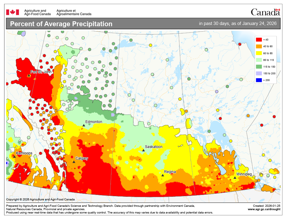 The chart below highlights the problem clearly, showing the percentage of normal precipitation across the Prairies over the past 30 days. Much of Alberta, Saskatchewan, and Manitoba has received well below average precipitation. In short, it’s been dry. Very dry. Without a shift toward more active storm systems, moisture shortages will persist, increasing risks for soil moisture recharge, livestock water supplies, and spring agricultural conditions.