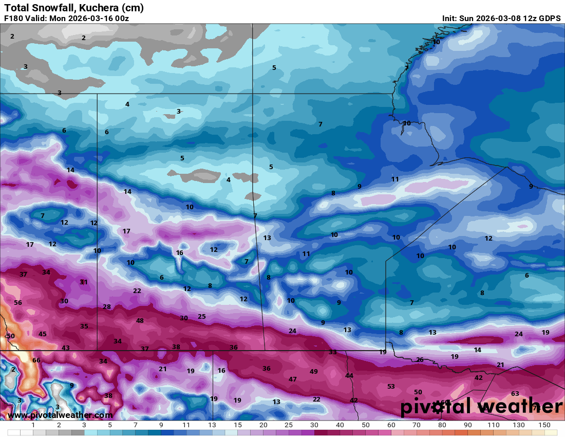 SNOW! Those who need snow are going to need this forecast. Those who love snow are going to love this forecast. After months of dry weather, significant snowfall is expected over the agricultural lands of the prairies this week. This is exactly what producers need as planting season approaches. The map below shows the expected snowfall accumulation up to early evening Sunday, March 15: