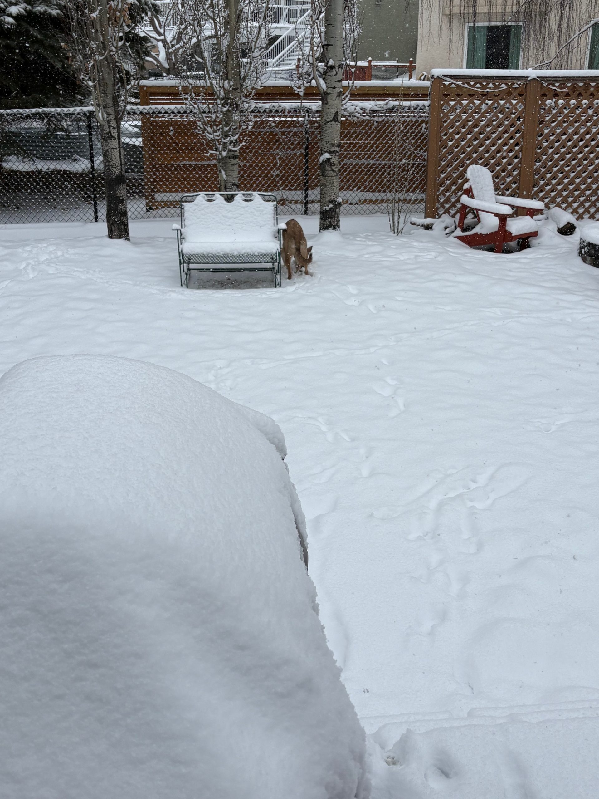 The dominant feature Thursday is an inverted trough extending northward from a surface low centered over central Montana. This trough is drawing a broad southeasterly flow across all three Prairie Provinces, transporting sufficient moisture to fuel a widespread precipitation event from Alberta to southwestern Saskatchewan. For Alberta, the heaviest snow is falling in my Calgary back yard: