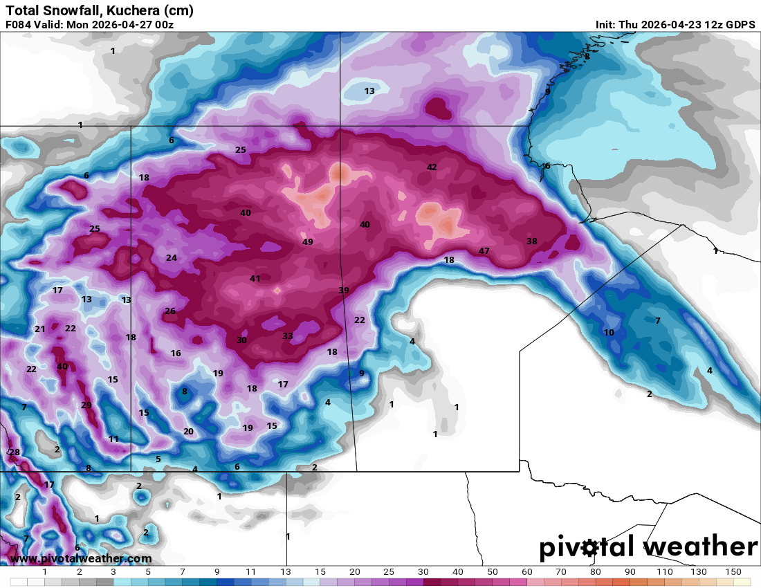Northeastern Alberta, including the Fort McMurray area, is catching the heavier snow from this system. Northeastern Saskatchewan and northwestern Alberta communities could receive up to 40 cm of snow during this late April storm. Snow continues into the weekend in these areas, though as you can see from the animated map, additional accumulations beyond Friday will be relatively minor.